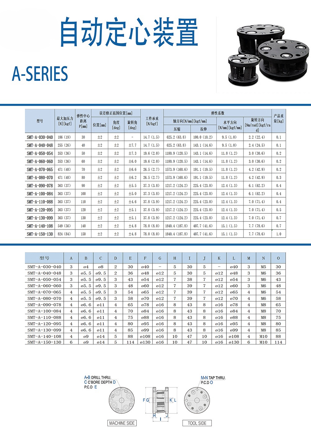 中心补正模块A系列是一种创新智能定心装置,主要用于补偿组装各种精密零件时出现的位置和角度误差,以提高组装质量。它广泛应用于变速器、发动机、马达、泵以及电子产品的自动化装配生产线中。A系列产品具有自动补正位置偏移和角度倾斜的功能,能够显著提高装配的良率,减少不良率,并保证压装品质。此外,该装置还能增强零部件之间的接合力,缩短生产周期,延长生产设备的使用寿命,并减少设备维护次数。A系列产品以其高精度和可靠性能,在精密压装设备上得到了广泛应用。