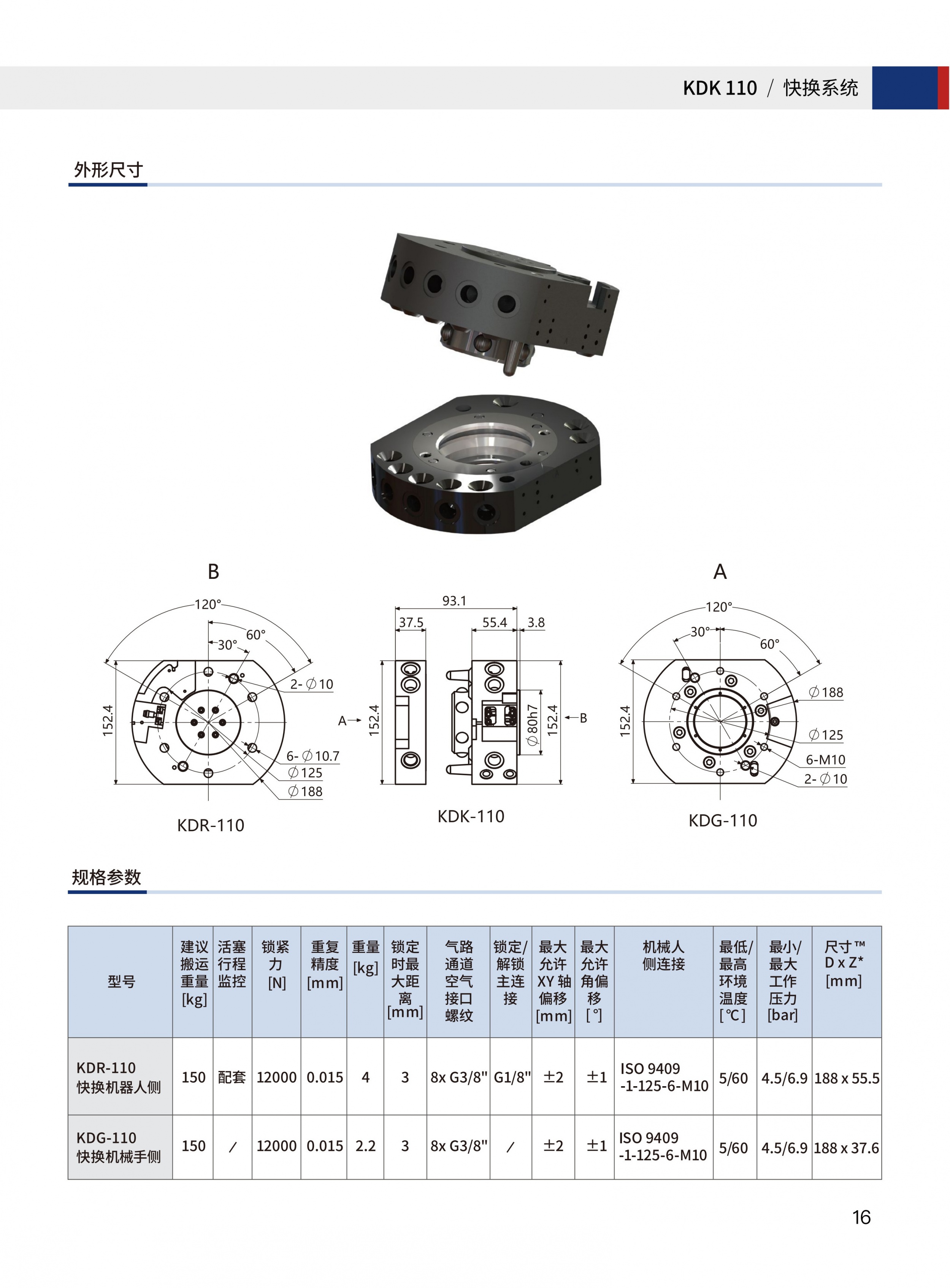 机器人气动快换装置KDR-110与KDG-110,专为承载150kg的重型工业机器人设计,集高效气动技术与超强负载能力于一身。这两款快换装置切换迅速、操作简便,能大幅提升生产线的灵活性和作业效率。它们特别适用于大型物件搬运、重型机械加工及装配等高强度作业场景,轻松应对各种高负载挑战。KDR-110与KDG-110以其出色的承载性能、稳定的结构和高效的操作性,成为自动化生产线中处理超重负载的得力工具。