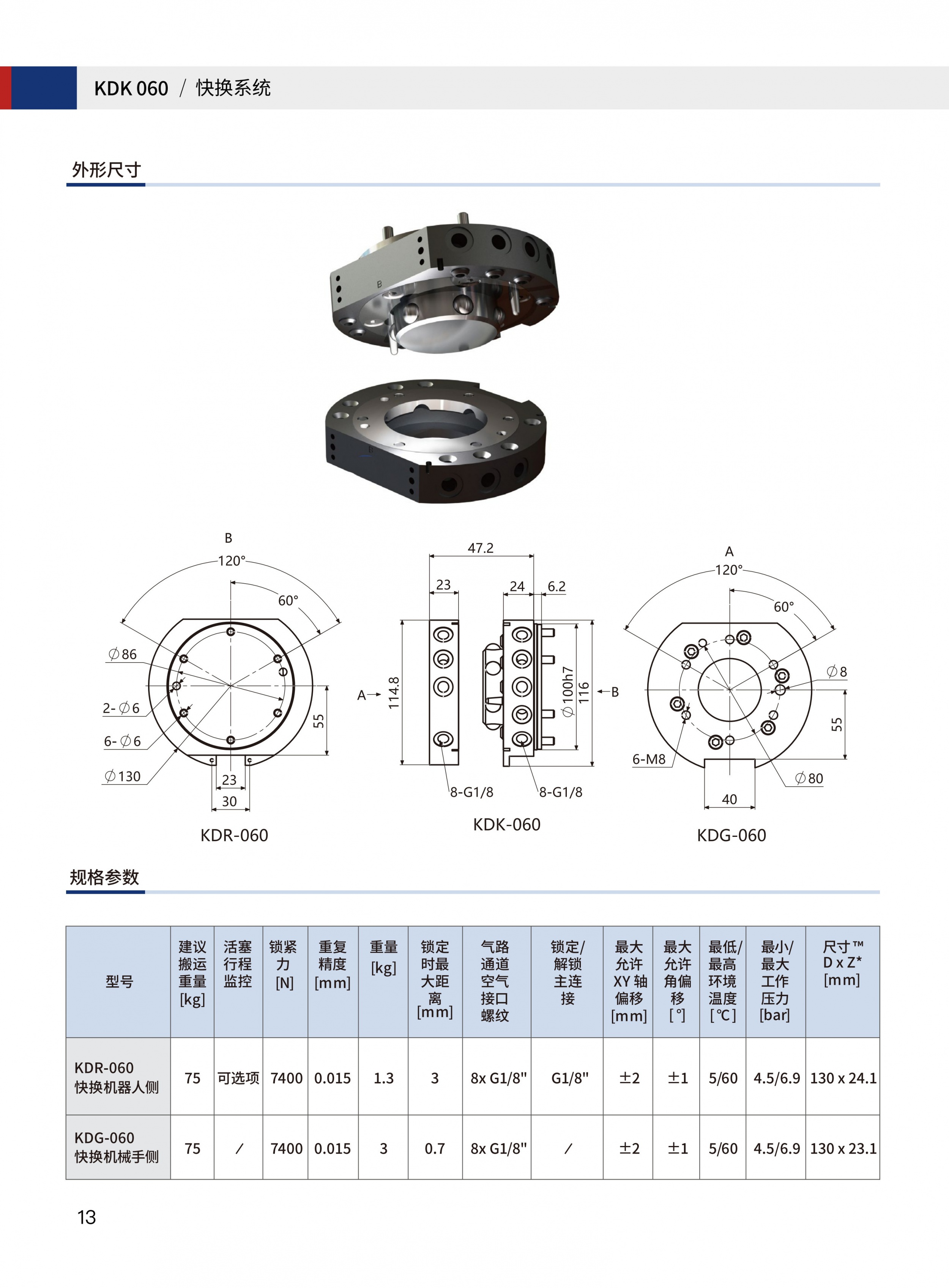 机器人气动快换装置KDR-060与KDG-060,专为负载75kg的重型工业机器人打造,具备强大的承载能力和高效的气动切换技术。这两款快换装置设计坚固耐用,操作简便快捷,能够实现末端执行器的快速更换,显著提升生产线的适应性和生产效率。它们特别适用于大型工件搬运、重型机械加工等高强度作业,是自动化生产线中处理重负载任务的得力助手。KDR-060与KDG-060以其卓越的性能和可靠性,助力企业高效应对各种重负载挑战。