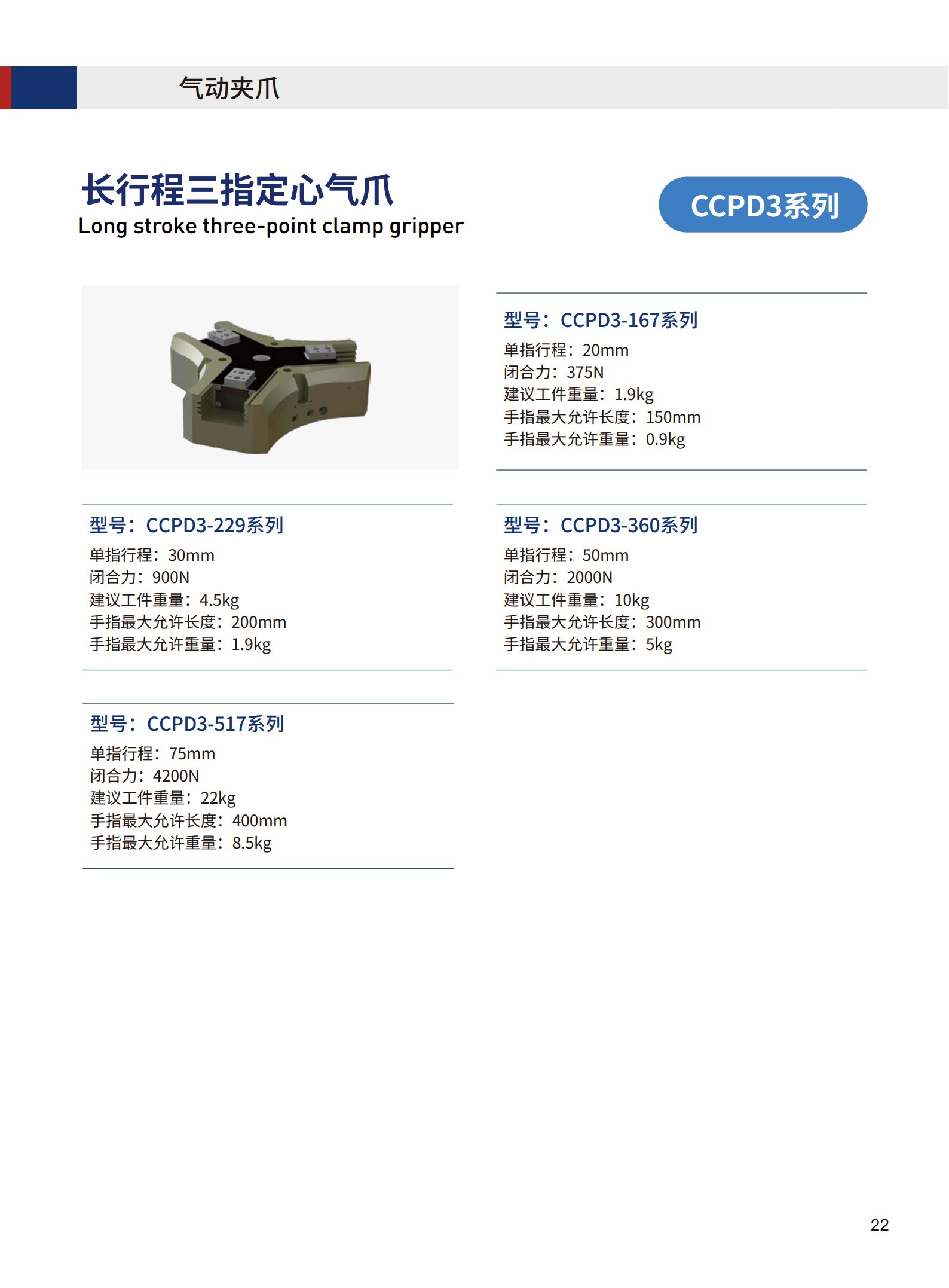 长行程三指定心夹爪CCPD3是一款具备长行程特性的夹爪装置,其三指设计可自动适应不同形状和大小的零件,实现精准抓取和放置。长行程特性使其适用于需要更大操作范围的工业自动化场景,提升作业灵活性和效率。