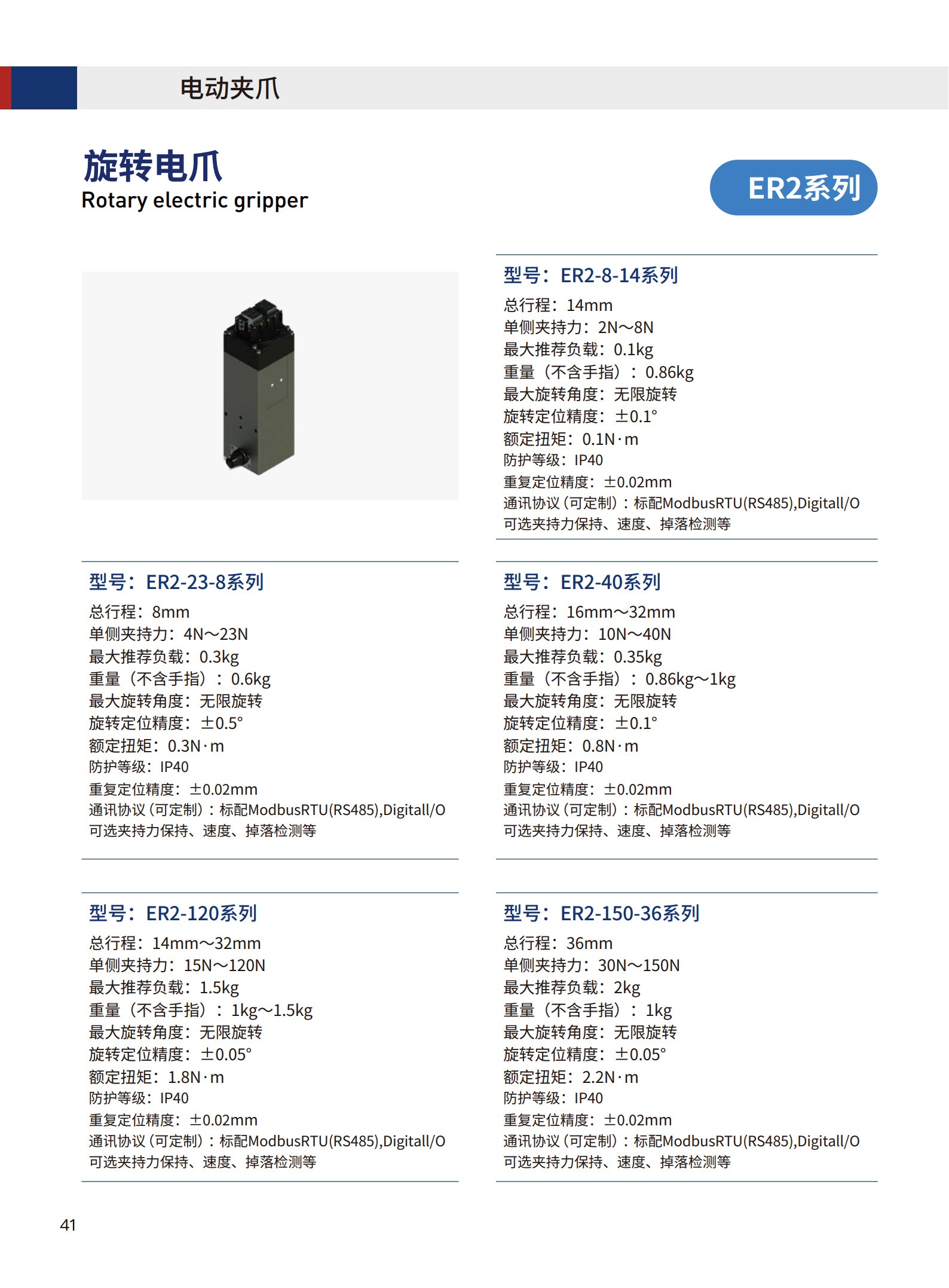 旋转电爪是一种具有高精度旋转与夹持功能的自动化夹持设备,夹持力范围在2-150N,行程可达14-36mm,适用于多种工业自动化应用场景。 在装配线上,旋转电爪能够协助机器人完成复杂、多角度的抓取任务,如夹持和旋转零部件进行安装,提高生产效率和产品质量。在物料搬运中,它可以快速、准确地抓取并放置各种形状和尺寸的物料。此外,旋转电爪还广泛应用于电路板装配、食品处理、医疗设备操作等领域,凭借其高精度、高效率的特点,成为各行业自动化和智能化的重要工具。