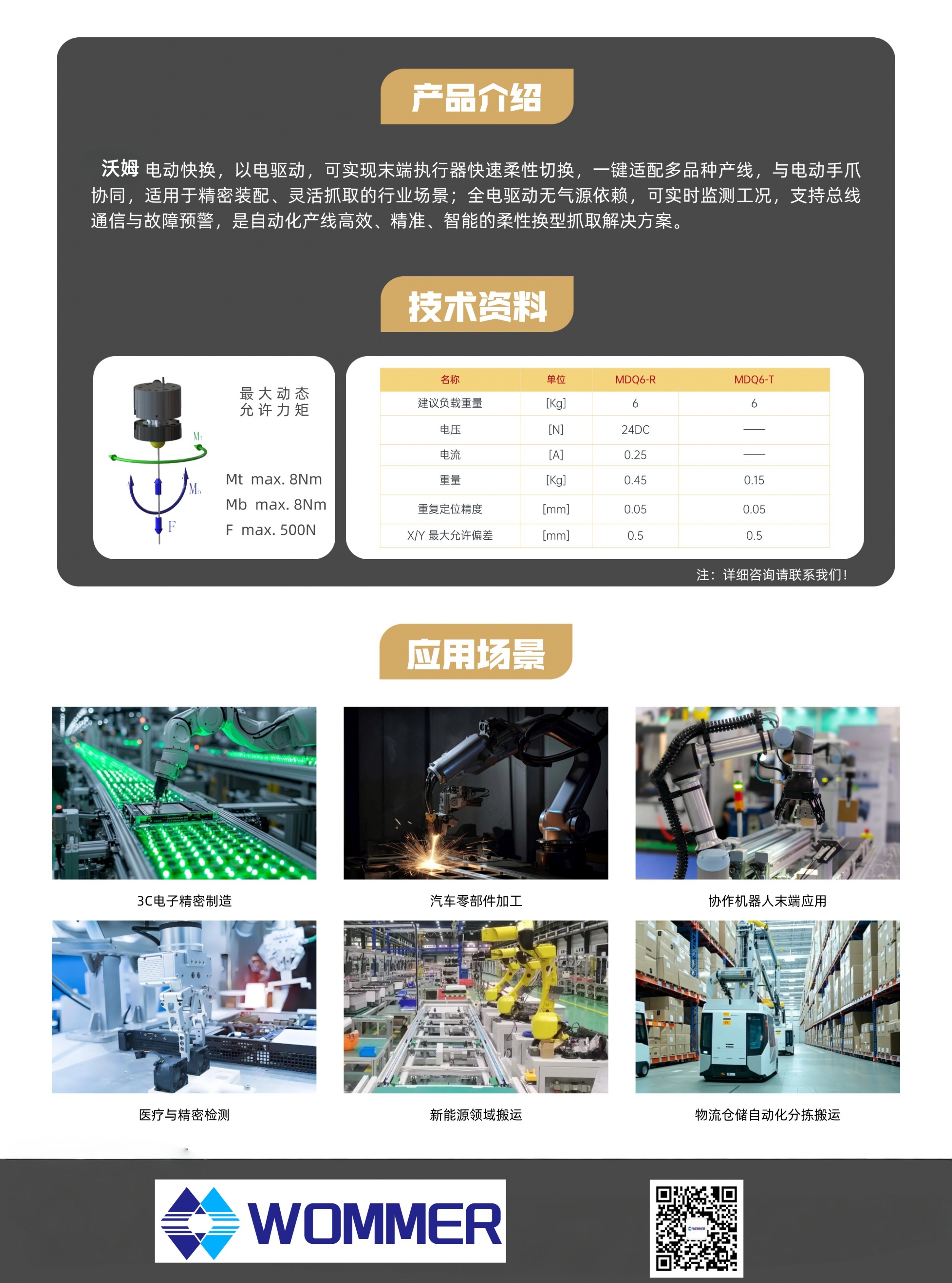 协作机器人电动快换MDQ6 负载6kg 以24V直流电源驱动,凭借通电解锁、断电锁紧的创新机制,实现3秒极速切换,为柔性制造注入强劲动能。其技术优势集中体现在三大核心领域: