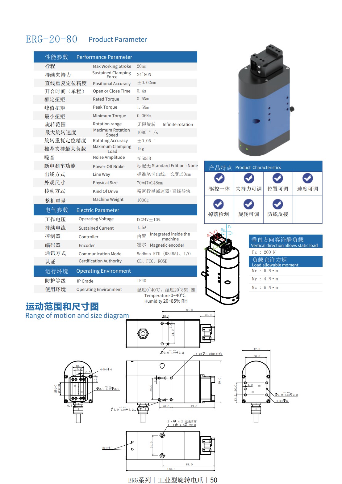 工业型旋转电爪 ERG-20-80 夹持力30-80N 行程20mm