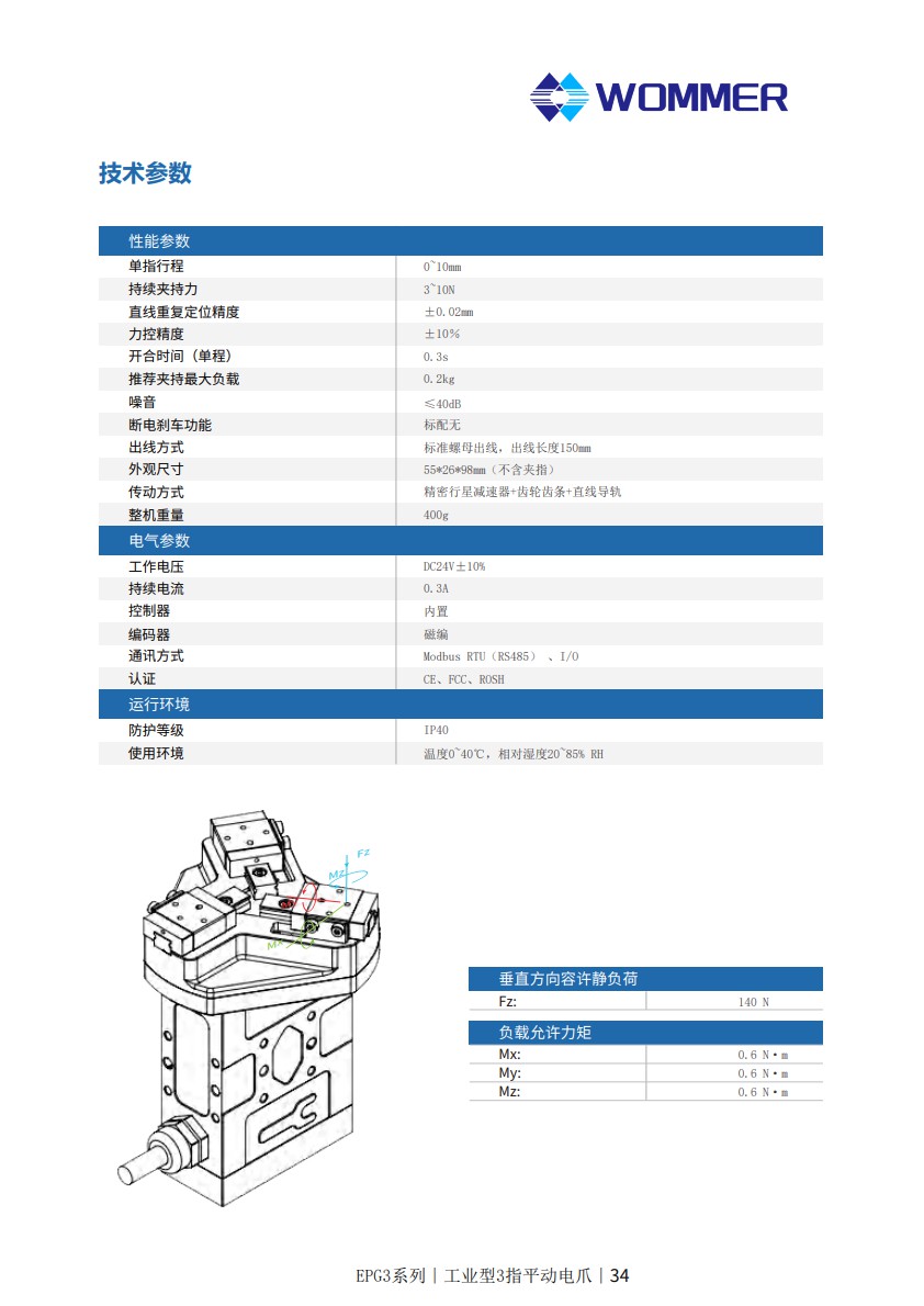 三指电动定心夹爪 EPG3-10-10 具备高精度、强适应性优势:三指设计可稳定抓取圆柱形、方形及不规则工件,避免偏移或滑脱;0-10mm 行程适配微小位移需求,满足精密装配、电子元件插装等精细操作;3-10N 可调夹持力可精准适配不同材质与形状工件,避免损伤或滑脱;电动驱动配合闭环反馈系统,重复定位精度高,开合响应迅速;模块化设计便于维护与集成,支持 IO-Link、EtherCAT 等主流通信协议,可无缝对接机器人控制系统,是精密制造领域的理想选择。