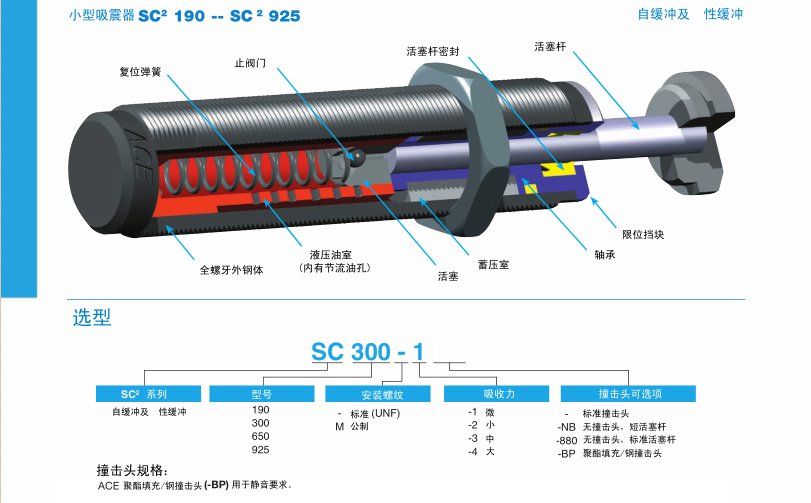 ACE SC系列成两种缓冲设计:撞击时自动感应撞击力量,无需手动调整的自缓冲设计,以及? 性缓冲设计,撞击时产生很小的回复力,达到完美的缓冲效果。其较长的缓冲行程,如 925 的行程为 1.58