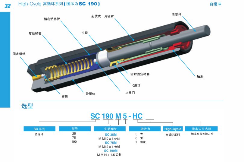 ACE Controls SC 25, 75 & 190-HC High-Cycle 高循环系列吸震器专为包装设备中高速运动部件而设计。本系列行程短,缓冲时间及回复时间短,自缓冲设计。应用时节省时间,提高生产率。