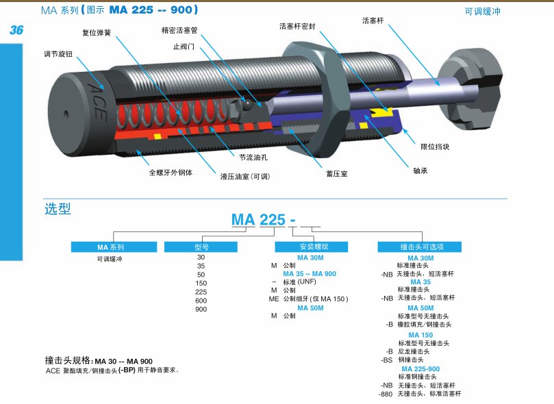 ACE MA系列可调小型吸震器调节范围广,可提供线性缓冲。如果选型应用时倾向于可调缓冲,则 MA 系列是***选择。