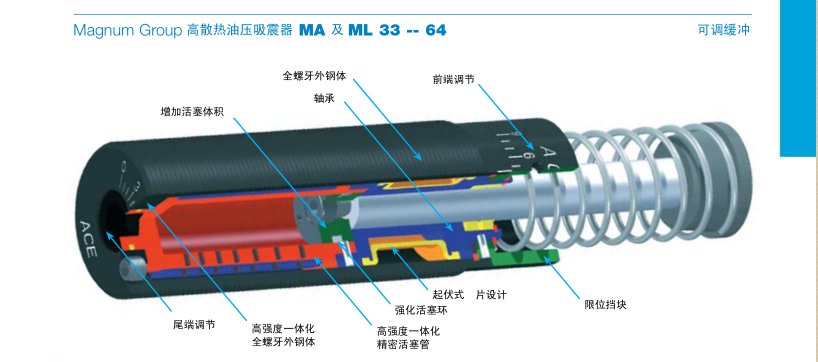 ACE Magnum Group高散热可调油压吸震器? 用专利设计,高性能密封、强化活塞环及液压油室,有效提高吸震器使用寿命。前置或尾端调节旋钮,全螺纹外钢体,便于安装。