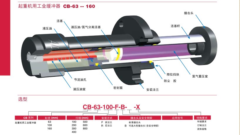 CB63-160起重机安全缓冲器 ACE CB 系列重型工业缓冲器专为重型机械设备紧急缓冲设计。负载低速运动时,缓冲器产生较小反作用力。紧急制动或负载高速运动时,缓冲器缓冲减速,保护机械设备。 本系列用工业缓冲器为独立免维护产品,内置多个节流油孔,可提供线性缓冲,并产生很小的反作用力。正常情况活塞杆伸出,当负载接触缓器时活塞杆压迫液压油通过节流油孔,将动能转化成热能散发,同时产生很小的反作用力。缓冲结束后,活塞杆内部氮气蓄压室提供缓冲器回位力,液压油回流,缓冲器回到初始状态。 应用: 起重机、输送机、转台